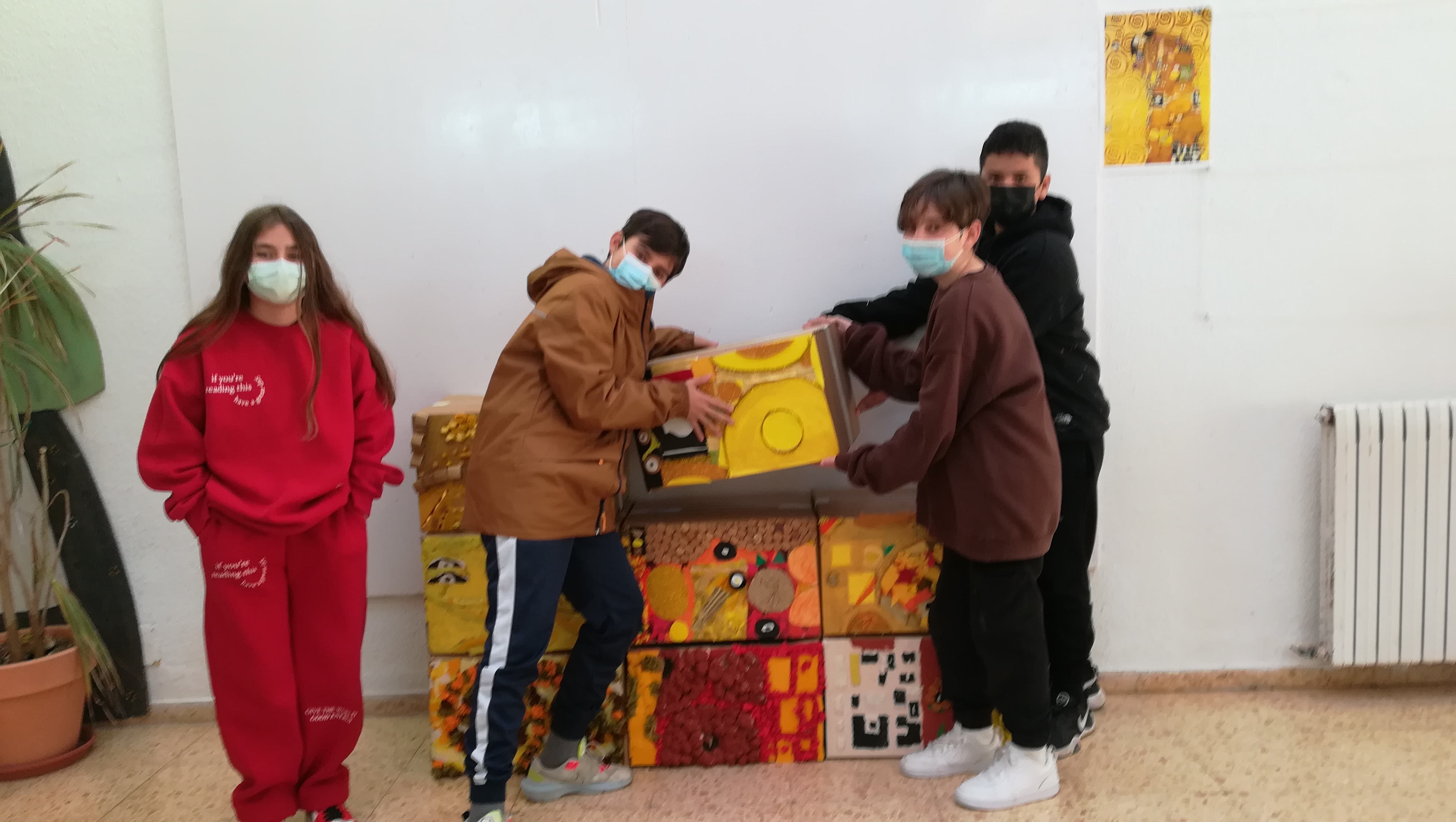 Una de les activitats del dia de la PAU ha consistit en reproduir el quadre L'ABRAÇADA de Gustav Klimt. A cada aula s'ha decorat una part de l'obra amb la tècnica del collage. Després cada classe ha anat col·locant la seva peça i ENTRE TOTS hem format el quadre. Ha quedat preciós!